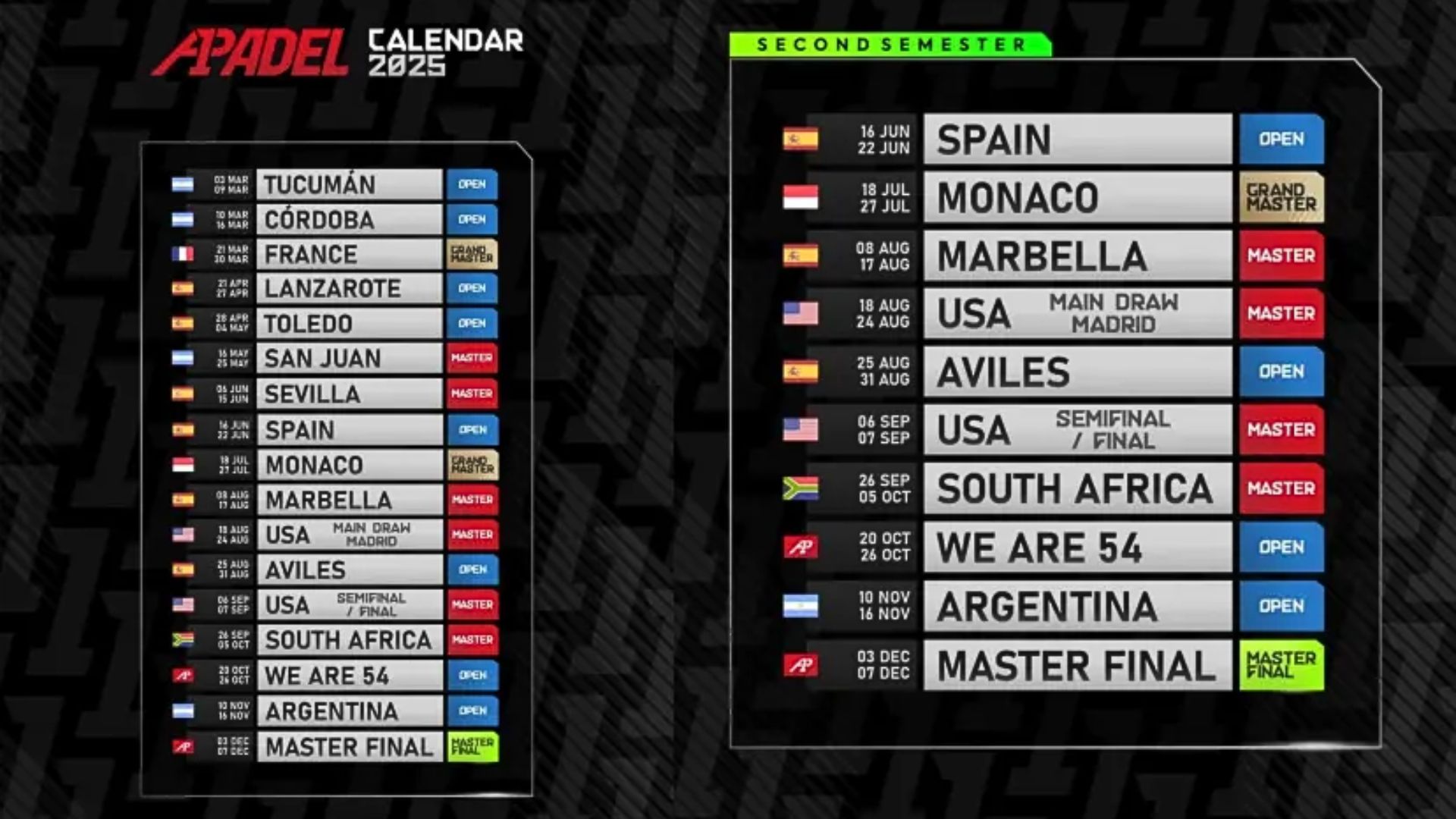 L’ultimo torneo “classico” della stagione si terrà a Argentina (10-16 novembre), terra imprescindibile del padel. Infine, il Final Master 2025 avrà luogo da Dal 3 al 7 dicembre, in un luogo ancora sconosciuto, ma che promette un grande festa per concludere la stagione in grande stile.