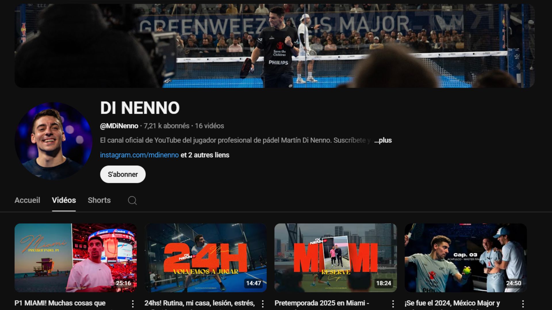 Lanciato alla fine della scorsa stagione, il canale YouTube di Martin Di Nenno (attualmente 8° al mondo) svela, attraverso sei video da 15 a 25 minuti, il dietro le quinte della sua vita quotidiana: la preparazione fisica, i momenti di vita con i suoi cari, l’incoronazione dell’Argentina all’ultimo Mondiale, la sua pre-stagione a Miami e persino immagini esclusive delle gare del circuito Premier Padel.