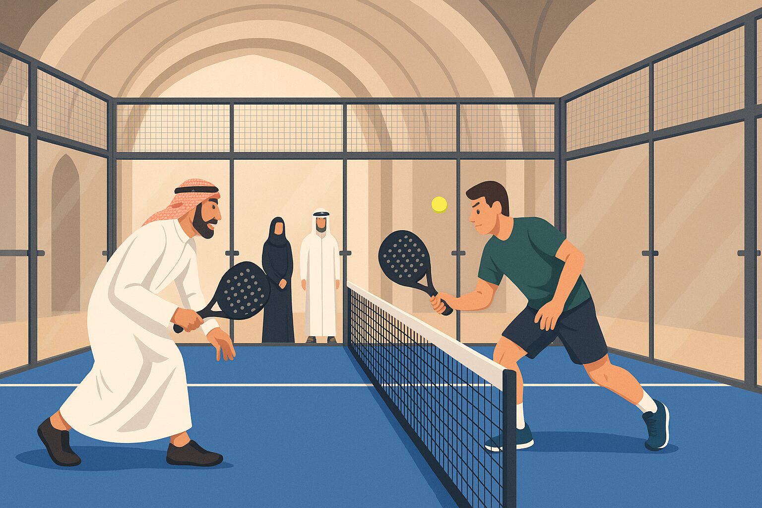 Nei paesi di Golfe, lo sviluppo del padel si adatta ai vincoli climatici e culturali locali. Lo sport sta vivendo una forte espansione, in particolare nel club al coperto, che vengono imposte come norma di fronte al perdita di velocità delle installazioni esterneTre paesi dominano il panorama regionale: Qatar le luci, Emirats Arabes Unis eécranArabia Saudita, ognuno con le sue specificità.