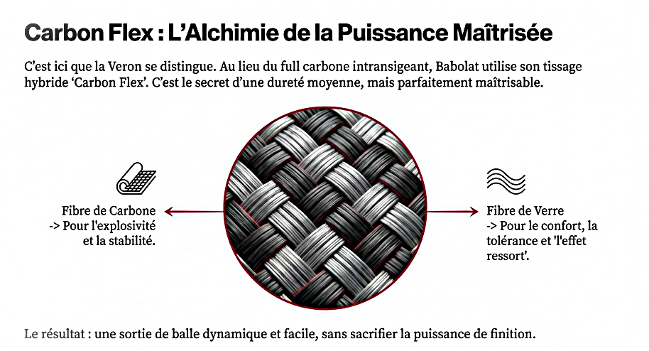 È qui che la Veron 3.0 trae la sua vera forza e si distingue dai suoi predecessori senza compromessi. Invece di un rigido telaio full carbon (spesso estenuante), Babolat scommetti su un rivestimento ibrido Carbon FlexL’alchimia si basa sulla sapiente combinazione di due materiali: